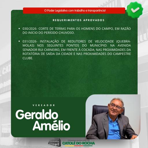 Durante a sessão ordinária da Câmara Municipal de Catolé do Rocha, o vereador Geraldo Amélio de Lima teve aprovados dois importantes requerimentos voltados ao fortalecimento da zona rural e à melhoria da segurança viária no município.