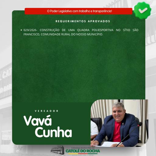 Durante a sessão ordinária da Câmara Municipal de Catolé do Rocha, realizada na tarde desta segunda-feira, o vereador Vavá Cunha (Valdeci Dantas da Cunha) teve aprovado o Requerimento nº 029/2026, no qual solicita ao prefeito Lauro Adolfo Maia Serafim a construção de uma quadra poliesportiva no Sítio São Francisco, comunidade rural do município.