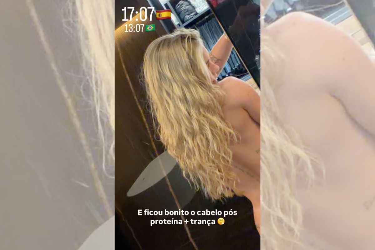 O clique, feito no closet da residência de seu namorado, o astro do Real Madrid Vini Jr., destacou o resultado de um tratamento capilar. “E ficou bonito o cabelo após proteína mais trança”, celebrou a loira na legenda da publicação feita nos Stories do Instagram.